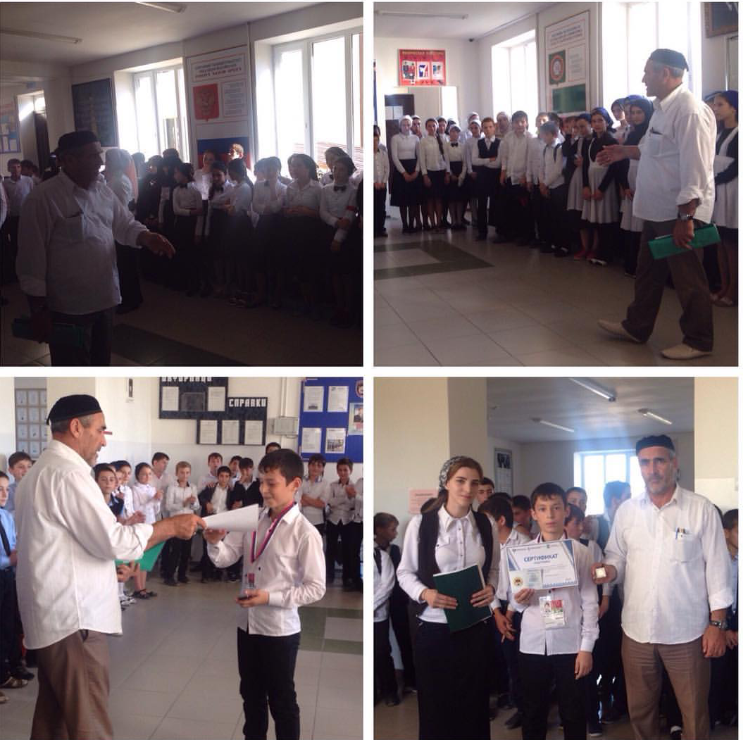 По возвращению из Белгорода участника фестиваля "Готов к труду и обороне" Чайтаев Башлам из 7 "Б" класса, где он был награжден золотым значком ГТО, у нас в школе состоялась торжественная линейка с вручением грамоты.